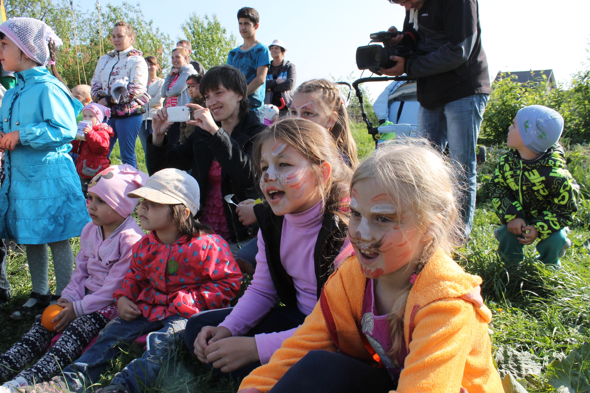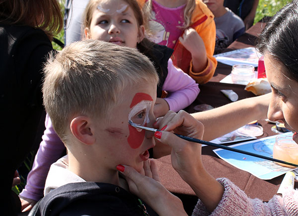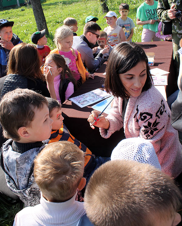 Подростки захлебываются от восторга: они в центре внимания, их буквально втянули по самые уши в искрометное представление, где в водовороте смеха, плясок смешались и Джек-Воробей, и Элли из Изумрудного города, и спортивные аттракционы. Затравкой праздника стала артакция: волонтеры вооружились специальными красками и, кто как мог, разрисовали рожицы самых маленьких участников шоу. У девчонок порой дрожали руки – боязно первый раз водить кисточками по детским лицам, но в итоге все получилось! Ребятня выходила от импровизированных художников в образе бабочек, кошек, отъявленных разбойников.