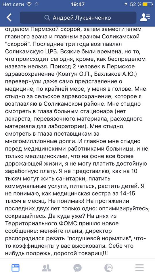 Андрей Лукьянченко, возглавлявший главную больницу Соликамского района, отправил в минздрав Пермского края заявление об оставлении должности по собственному желанию. По словам врача, его вынудило уйти «полное уничтожение краевой медицины».
