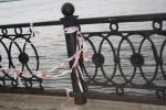Не только провалы в тротуарной плитке беспокоят жителей Хабаровска. В металлическом парапете, который отделяет тротуар от Амура, зияет дыра. Высота от площадки, по которой гуляют люди, до воды примерно 5-7 метров, а в образовавшуюся дыру с легкостью пройдет ребенок. Все, что сделали в этом месте – оградили дыру красной лентой, ремонтировать сломанный парапет не спешат.