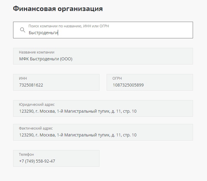– Название МФО, с которой возник спор. Воспользуйтесь встроенным поиском – начните вбивать название организации, все поля заполнятся автоматически после выбора компании.