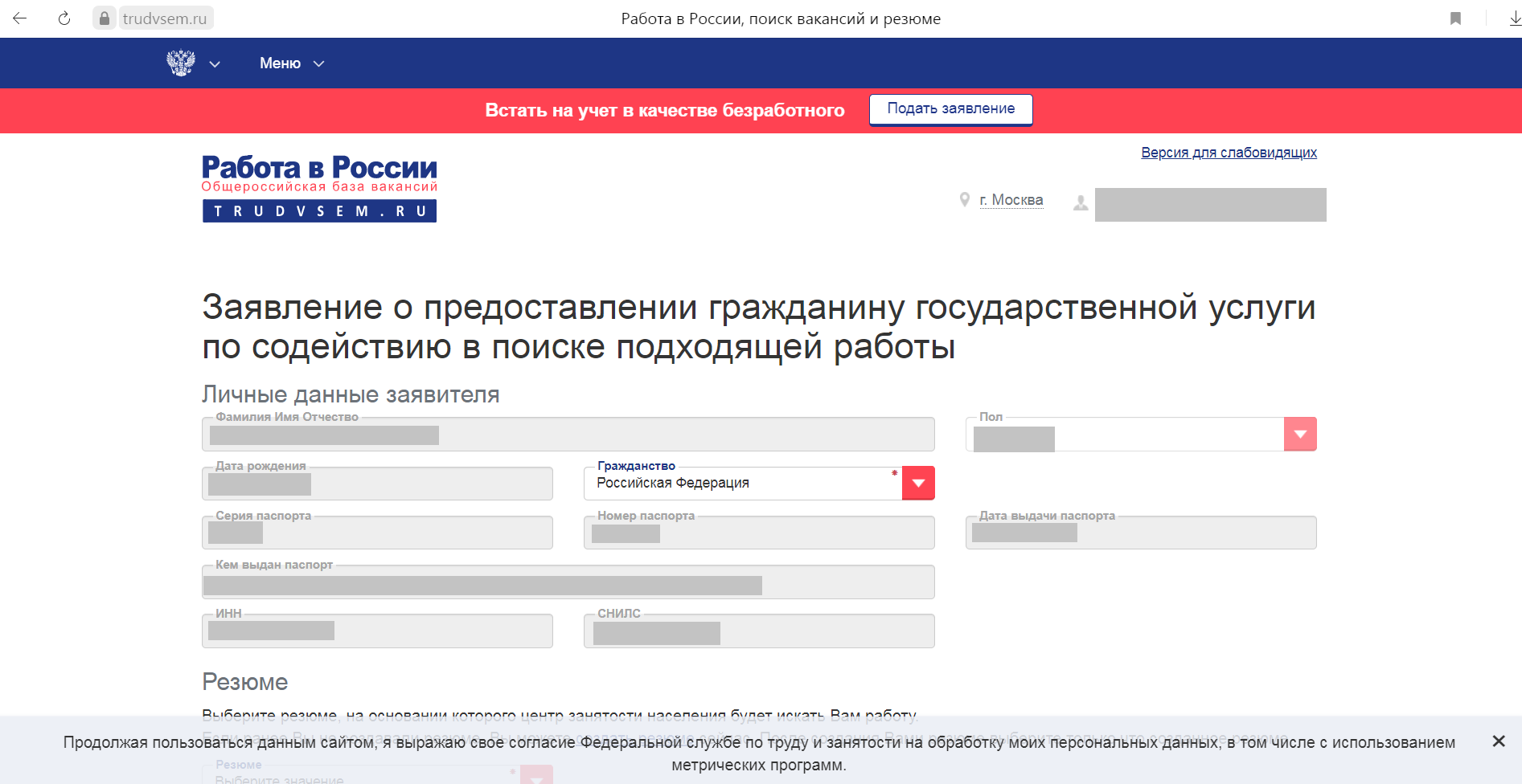 Жители Москвы могут заполнить заявку в электронном виде на сайте Центра занятости населения «Моя работа». Сайт использует сервис Госуслуги, регистрация и подача заявления занимает несколько минут.
