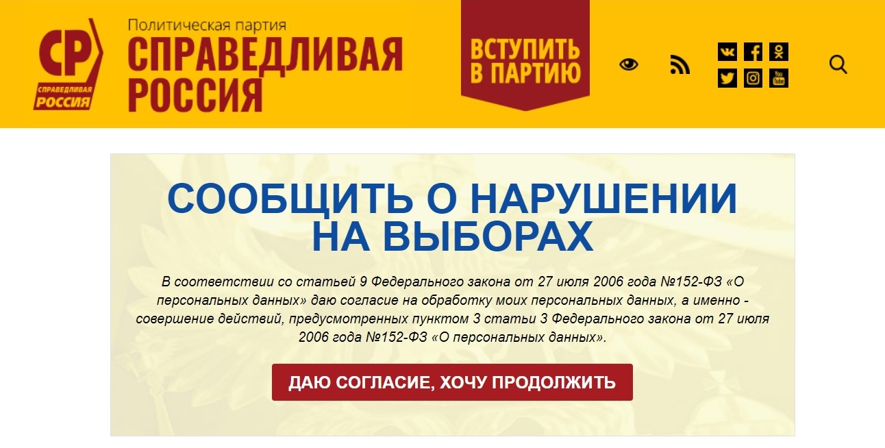 «Справедливая Россия» запустила на своих сайтах «горячую кнопку» для отправки зафиксированных нарушений на выборах.