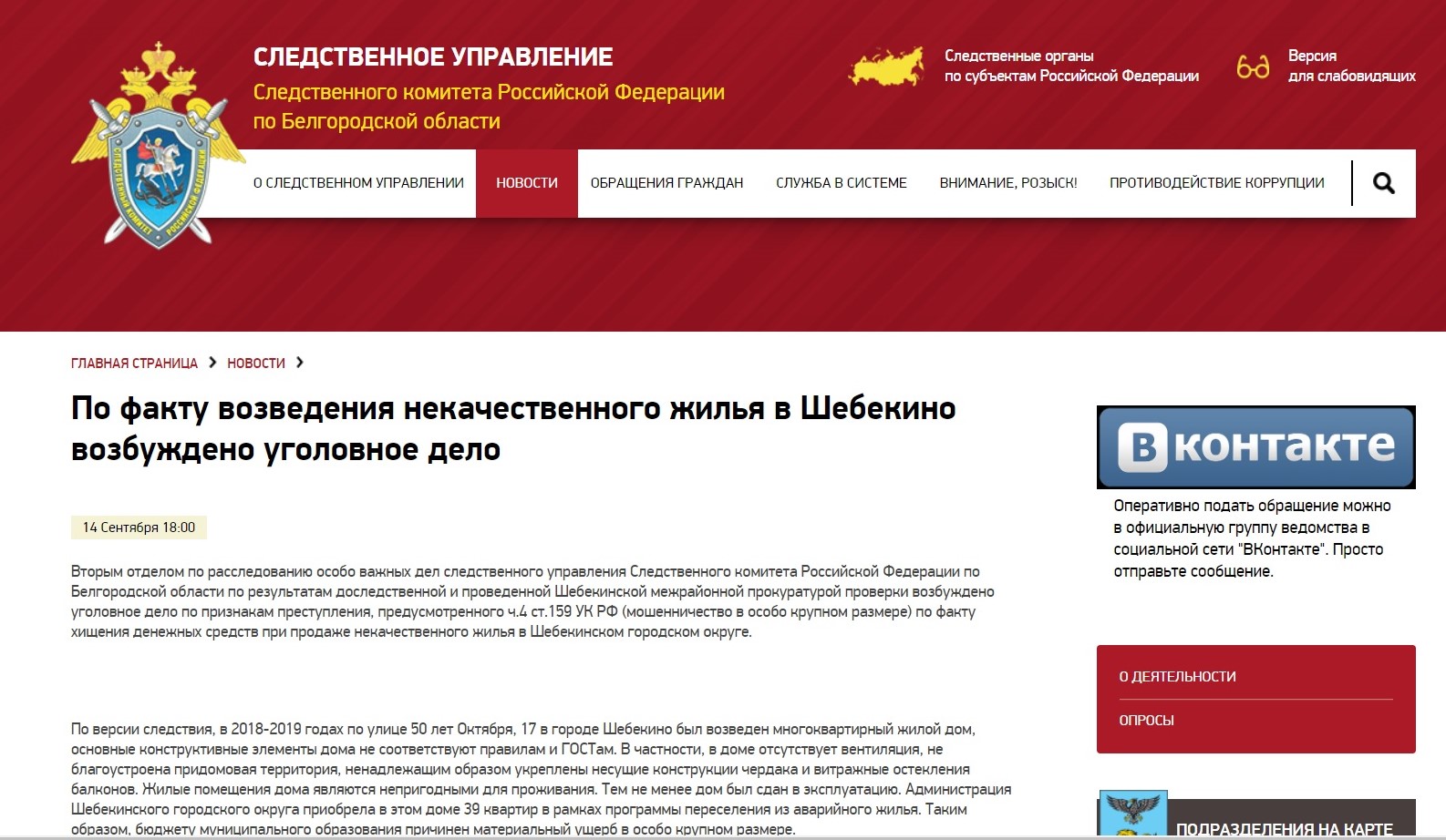 По результатам доследственной проверки второй отдел по расследованию особо важных дел СУ СК РФ по Белгородской области возбудил уголовное дело по ч.4 ст.159 УК РФ «Мошенничество в особо крупном размере» по факту хищения денежных средств при продаже некачественного жилья в Шебекинском городском округе. Речь может идти о 46 миллионах рублей. Если брать в расчет примерную рыночную стоимость жилья в этом доме – 46 304 рубля за кв. метр.