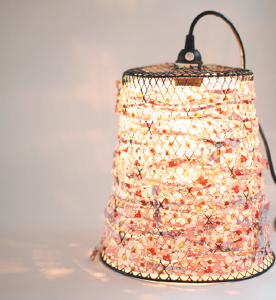 Потребуется: пластмассовая корзина для мусора, провод с патроном и полоски ткани.