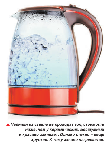 Если чайник из стекла – это к тому же зрелищно и бесшумно. Если сделан из керамики, – дольше удерживает тепло и не шумит. Немаловажен и вес чайника. На тот случай, если им будут пользоваться ваши дети или пожилые родители.