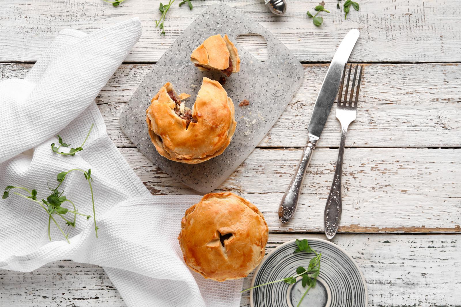 Из слоеного теста вырезать необходимое количество кружков, выложить их в формы для выпекания, смазать тесто взбитым желтком и выложить на них начинку. Сверху накрыть такими же кружочками из теста и выпекать в разогретой духовке в течение 15–20 минут. Готовые пироги посыпать тертым сыром.