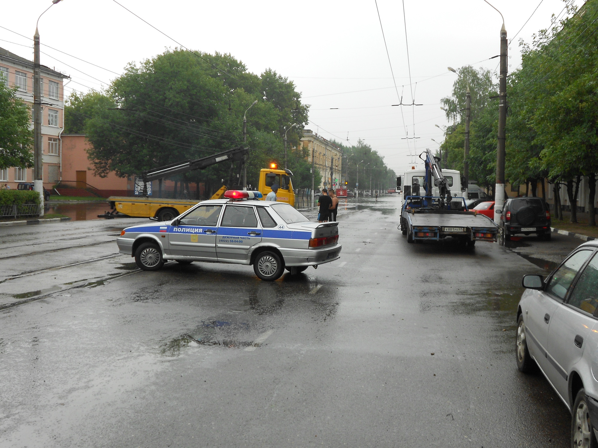 По колено в воде посредине улицы разгуливают прохожие с мобильниками и снимают происходящее на телефоны. Тут же стоят две пожарные машины: 131-е ЗИЛы, с колесами высотой в половину человеческого роста. Колеса в воде по обод… В общем, апокалипсис локального характера.