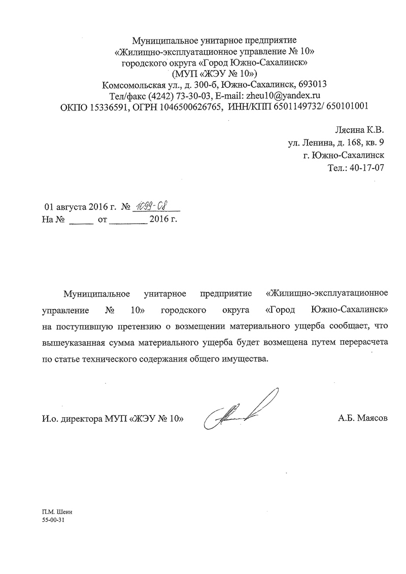 – Подать Претензию в УК, с указанием размера ущерба и порядком его возмещения. Зарегистрировать входящий номер обращения.