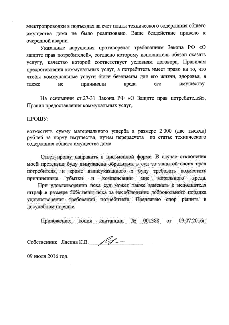 В результате совместных усилий специалисты Центра защиты прав граждан помогли Кристине Валерьевне Лясиной в досудебном порядке урегулировать вопрос по возмещению ущерба от некачественной услуги (замыкание участка внутридомовой электрической проводки), в связи с чем был причинен ущерб имуществу. УК МУП «ЖЭУ-10» одобрена претензия на возмещение материального ущерба в размере 2000 рублей, путем перерасчета по статье технического содержания ОДИ МКД.