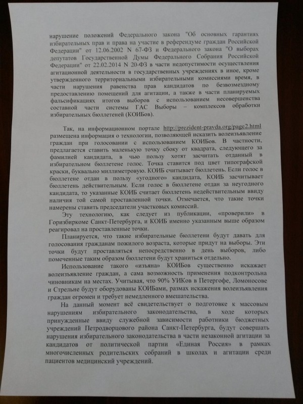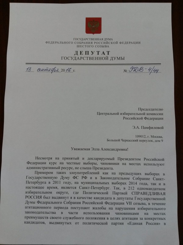 Парламентарий также указывает на то, что принужденные ввиду служебной зависимости работники бюджетных учреждений Петродворцового района нарушают избирательное законодательство, когда агитируют за кандидатов от «Единой России» на родительских собраниях в школах, среди пациентов медицинских учреждений, в связи с чем нарушается равенство прав кандидатов по безвозмездному предоставлению помещений для агитации.