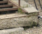 Когда-то пролеты между ступеньками были сделаны с просветами, что придавало легкости бетонной конструкции. Теперь же крыльцо перекосилось, и бывший элемент декора превратился в ловушку для детских ножек.