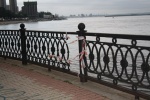 Гуляя по набережной имени Невельского в Хабаровске, можно не только получить эстетическое наслаждение от прогулки, но и получить травму. Тротуарная плитка местами просела, а посреди металлического заграждения зияет дыра, в которую легко может «выйти» ребенок.