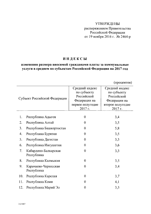 Распоряжение Правительства Российской Федерации от 19.11.2016 № 2464-р, опубликованное на официальном-портале правовой информации, установило повышение тарифов на коммунальные услуги в России по всем регионам. В среднем «коммуналка» для жителей страны подорожает на 4 %. Рост цен запланирован с 1 июля 2017 года.