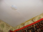 Рядом в светлой комнате ситуация не лучше. Цветочки на аккуратных обоях пожелтели, а местами и вовсе почернели. Синий тазик на полу все еще ловит набухающие на потолке капли.