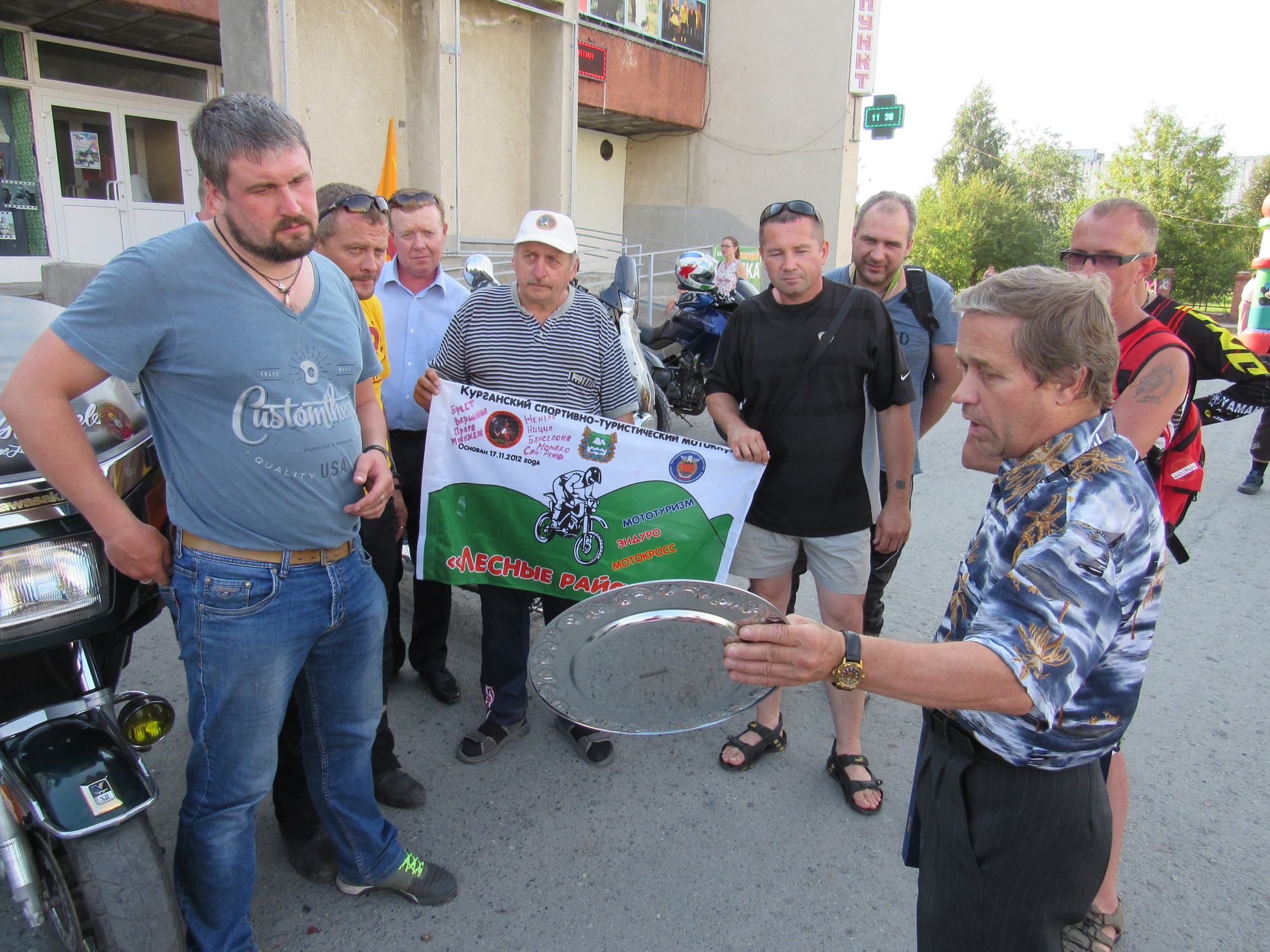 Далее мотоинспекцию ждали в мироновском Центре. Ведущий встречи Александр Голованов угостил гостей зауральским квасом и преподнес блюдо с символом Кургана – рыбкой пелядь. После небольшого рассказа об истории города еще один подарок передал Сергею Миронову руководитель Центра Андрей Кисель.