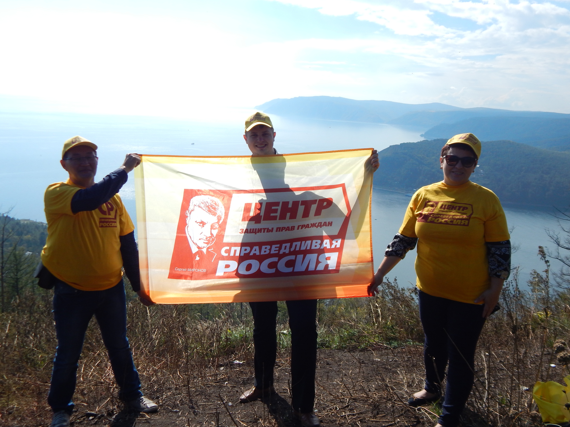 Забравшись на камень и налюбовавшись на красоту, открывающуюся с вершины, специалисты растянули флаг Центра. Многие туристы с интересом наблюдали за событиями и беседовали с сотрудниками Центра защиты прав граждан «Справедливая Россия».