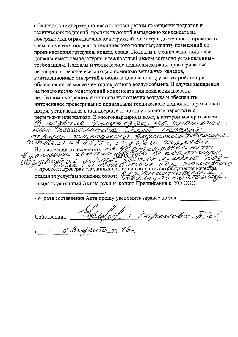 В УО «ЖЭУ-2» Татьяна Петровна неоднократно обращалась лично с просьбами, а потом и требованиями принять меры оп устранению протекания и осушению подвала.