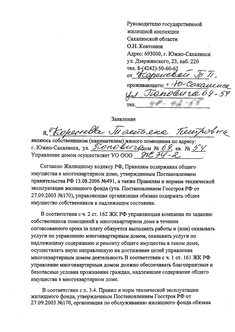Татьяна Петровна заполнила заявления в ГЖИ (о затоплении подвала) и бланк заявления в администрацию города на перенос сроков по капитальному ремонту (в частях подвального помещения и водоотведения).