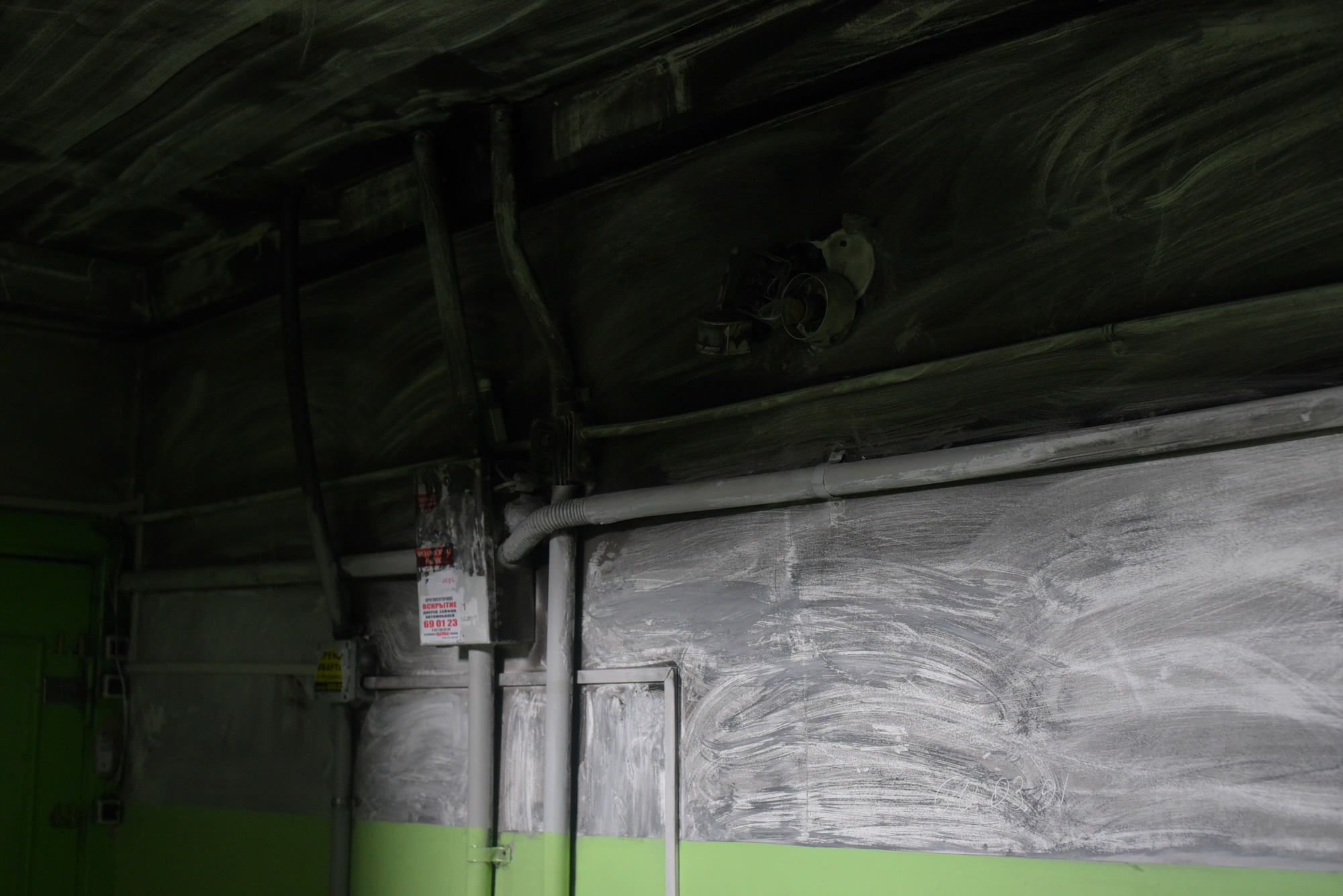 В конце 2015 года в подъезде жилого дома в Мурманске произошло возгорание. Пожар быстро потушили, но три этажа подъезда успели покрыться черной копотью. Сотрудники управляющей компании лишь частично отмыли подъезд, оставив черными потолок и верхнюю половину стен. Тратиться на побелку коммунальщики не хотят. Вмешался мироновский Центр.