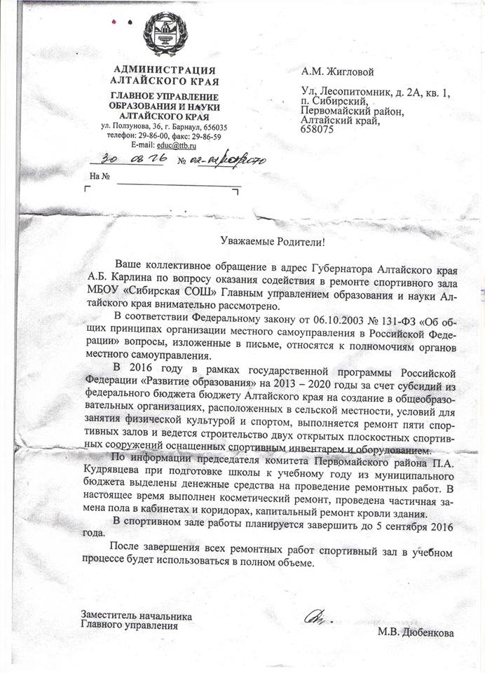 На фото – ответ из краевого управления по образованию о проведенном ремонте в общеобразовательной школе поселка Сибирский.