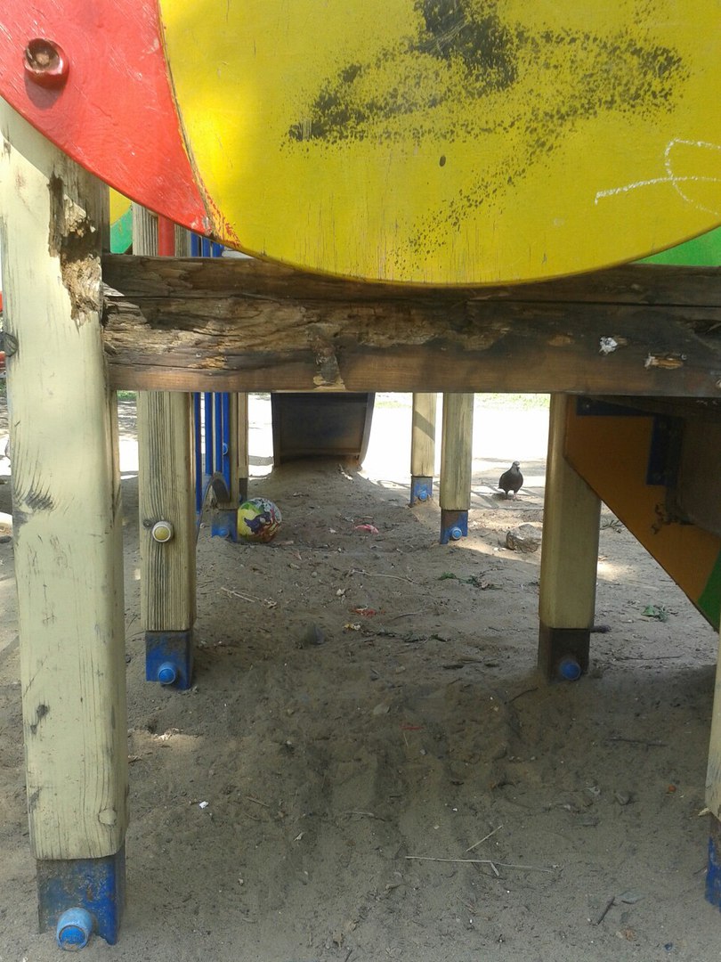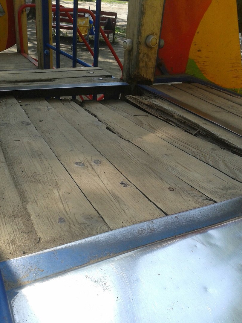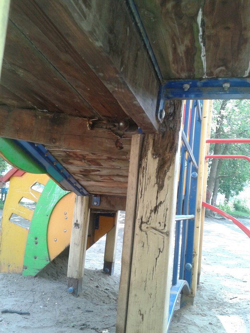 Уголок для детских игр во дворе собственники обустраивали своими силами: сами поставили ограждения, покрасили площадки, ремонтировали деревянные лестницы и опоры горки. Но за прошедшие несколько лет все это обветшало и стало непригодным. Дети, играющие на хлипких иссохшихся досках, могут упасть и получить травму. А УК к сожалению готова только уничтожить детскую площадку.