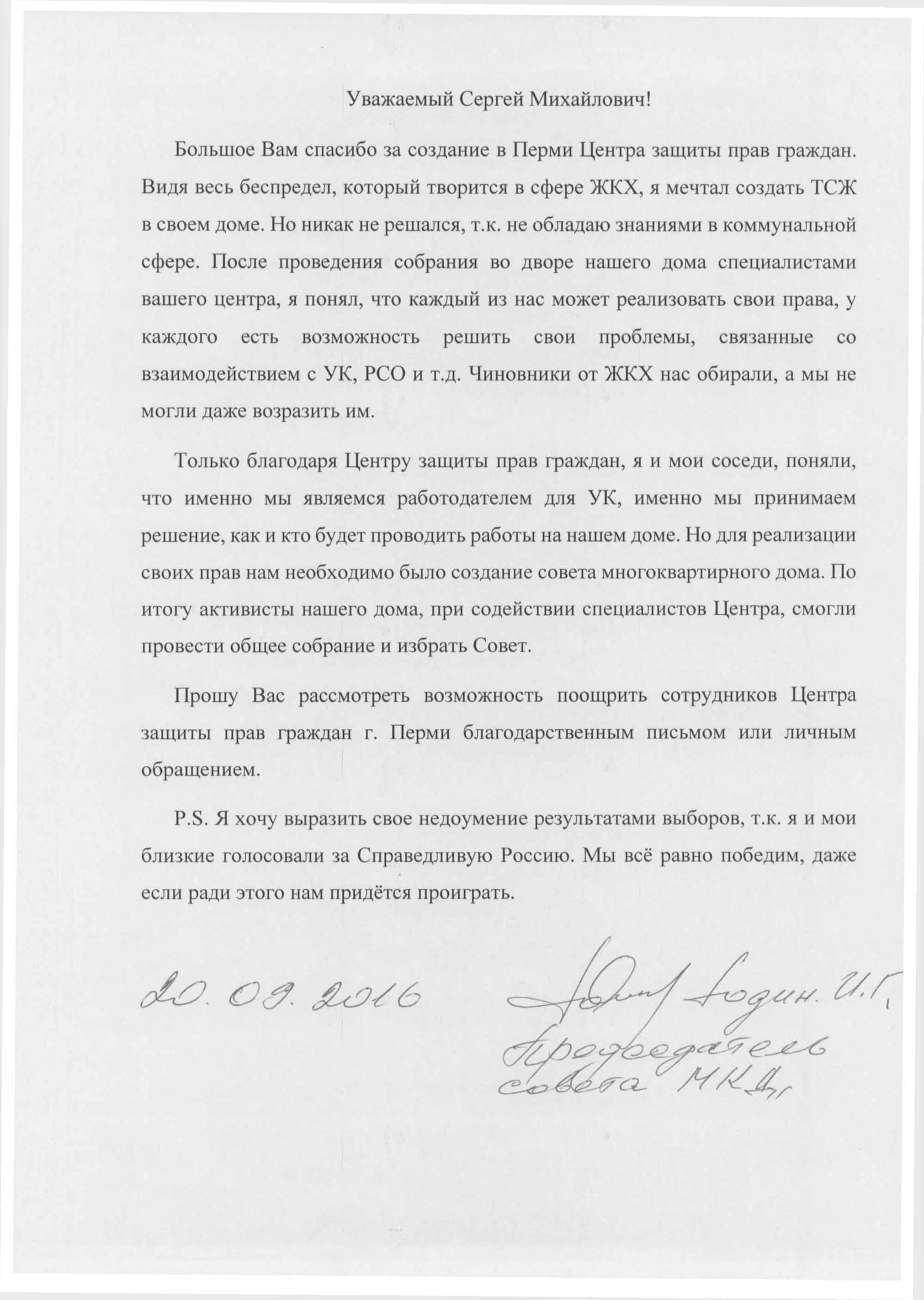 Многие горожане написали персональные письма лидеру партии «Справедливая Россия» Сергею Миронову, в которых выразили поддержку проекта Центров справедливости и недоумение невысоким результатом партии, которую они поддержали.