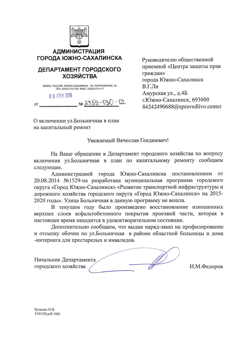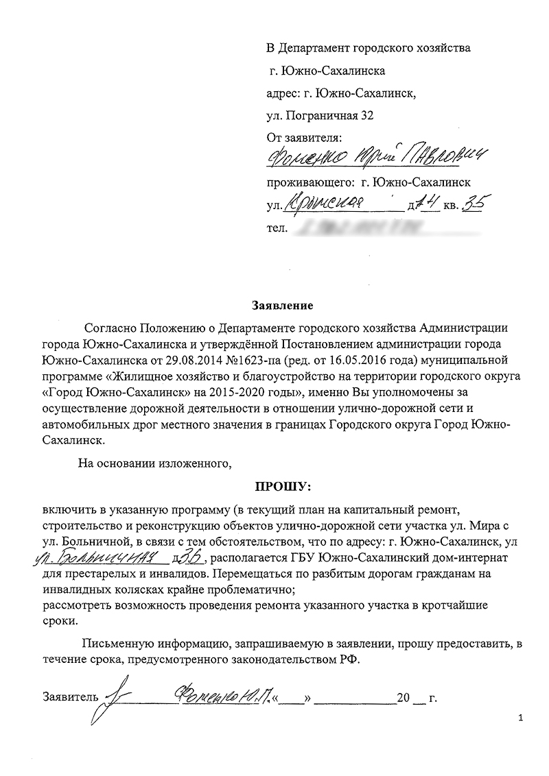 Юрий Петрович заполнил заявление о проблеме аварийного участка дороги в Департамент городского хозяйства (о включении указанного земельного участка в муниципальную программу «Жилищное хозяйство и благоустройство на территории городского округа «Город Южно-Сахалинск» на 2015-2020 годы»).