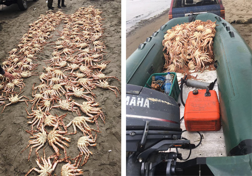 Рейд по заливу Терпенья выявил трех лиц, занимавшихся незаконной добычей водных биоресурсов. Задержали браконьеров с поличным, изъяли незаконный улов и средства вылова – 190 экземпляров камчатских крабов, из них треть – самки, общим весом два центнера. Предварительный ущерб государству от действий браконьеров составил около 160 тысяч рублей. Это только суточный улов одной группы из трех человек на одном маломерном судне – резиновой лодке с подвесным мотором.