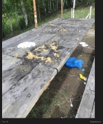 Повеселились ребята на славу, судя по выпитым бутылкам горячительного, а вот горы мусора, построенные навесы, разбросанные полиэтиленовые пакеты и одноразовую посуду, дрова и кострище за собой не убрали.