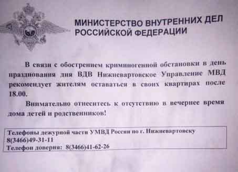 На подъездах жилых домов появились листовки с рекомендацией не выходить после 6 вечера на улицу, «в связи с обострением криминогенной обстановки в день празднования дня ВДВ». В объявлении также говорится о необходимости внимательно отнестись к отсутствию дома детей и родственников.