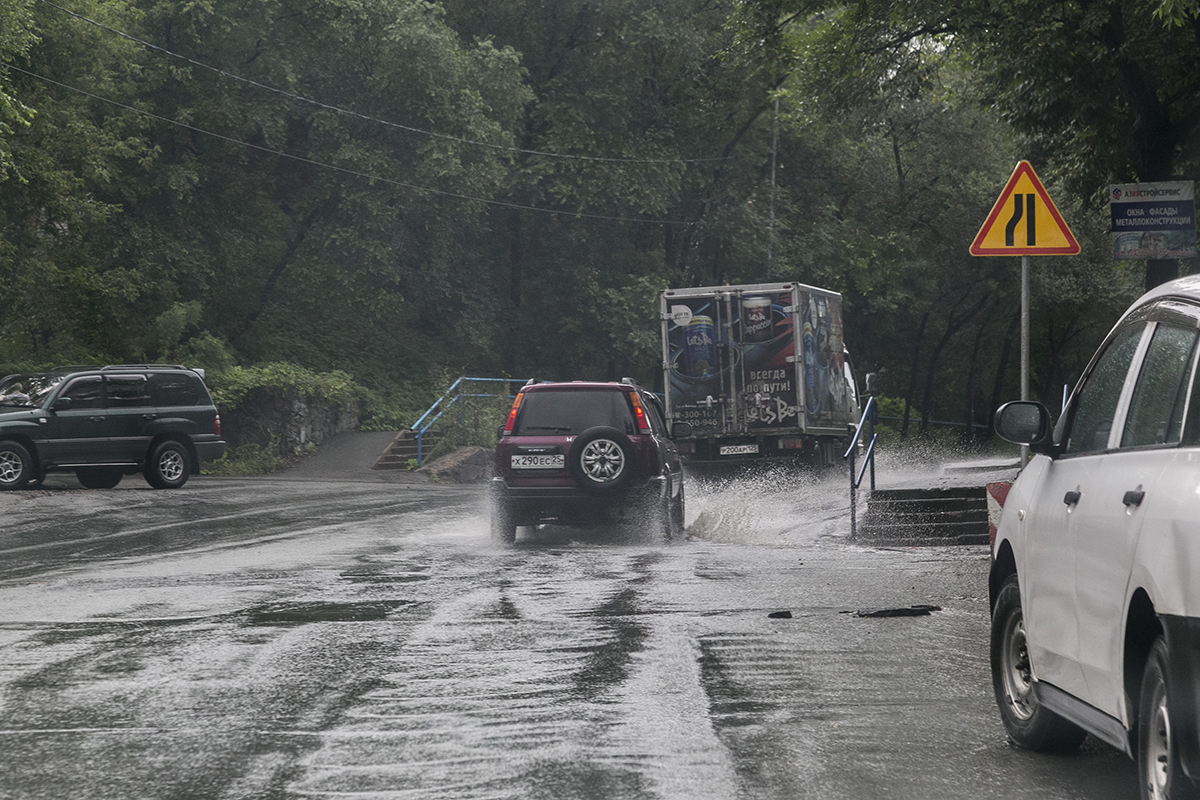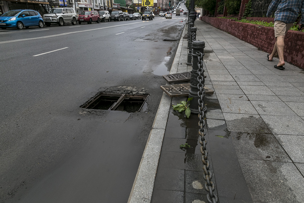 В ночь на 25 августа во Владивосток пришла непогода. Дождь и сильный ветер добавили проблем горожанам. Дело в том, что Владивосток давно уже не может справиться с любыми осадками: система ливневой канализации в городе практически уничтожена. Коммунальщики, чтобы вода уходила с дорог, поднимают решетки колодцев, никак не предупреждая об этом водителей и пешеходов.