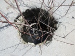 Во дворе дома на Солнечном бульваре, 14 – открытый люк. Местные автолюбители называют ее ловушкой и, чтобы не угодить в яму, воткнули в него дерево. Но для невнимательных жителей и гуляющих детей открытый люк может иметь страшные последствия.