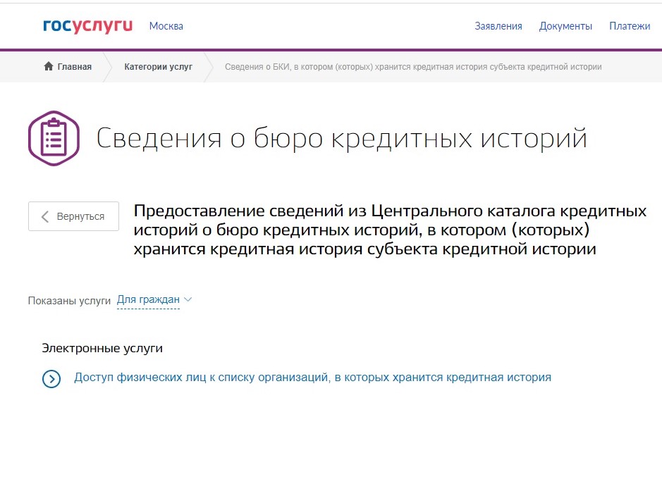 Затем нажмите на раздел «Сведения из бюро кредитных историй». В списке услуг выберите «Получение сведений из ЦККИ о БКИ, в котором (которых) хранится кредитная история субъекта кредитной истории – физического лица».