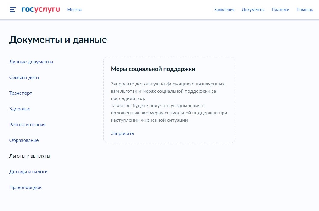 4. Нажмите «Запросить» в блоке «Меры социальной поддержки».
