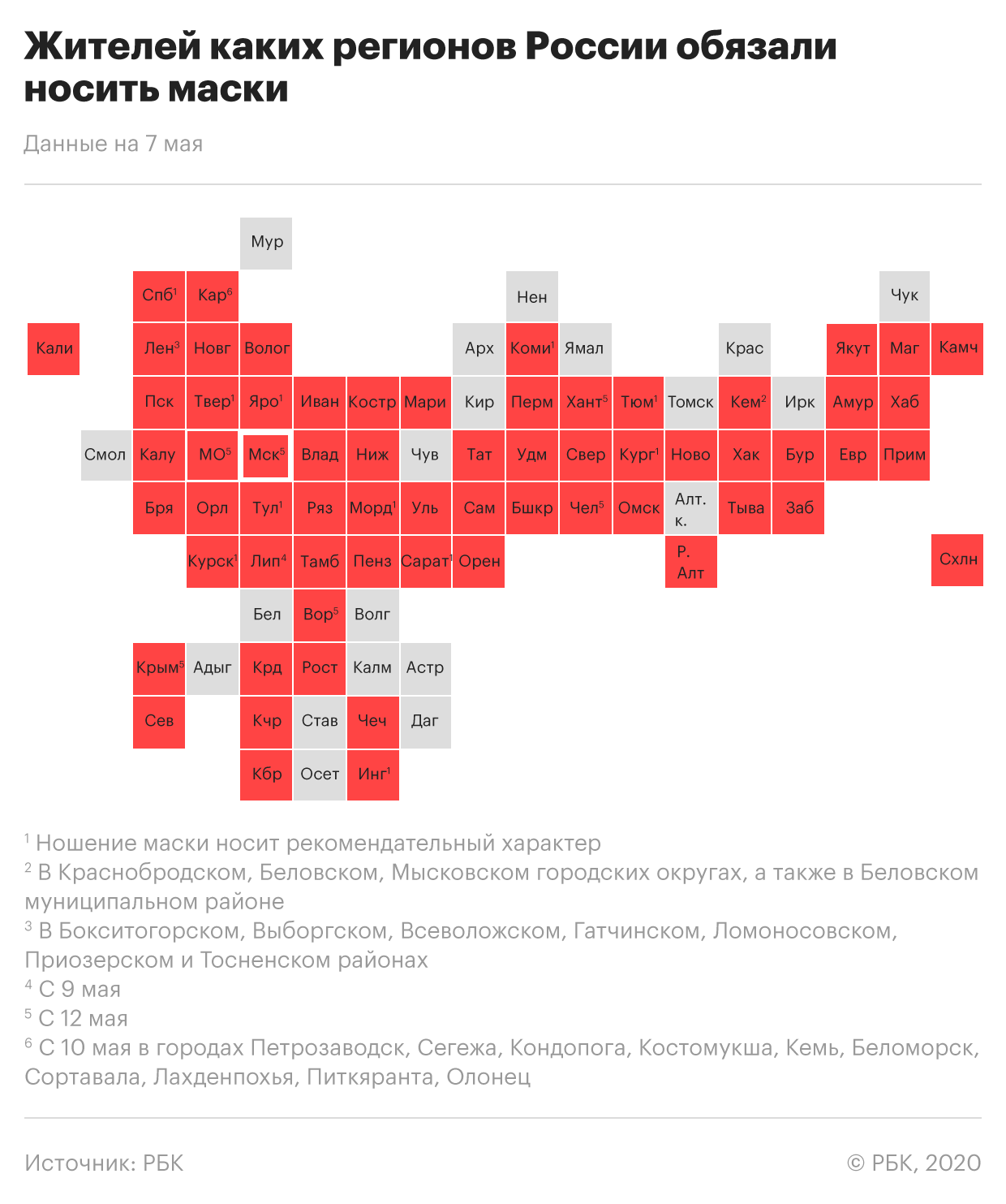 С 9 и 10 мая 2020 список пополнят еще два субъекта. После окончания праздников, с 12 мая – еще шесть регионов. В итоге маски обяжут носить в 65 регионах страны.