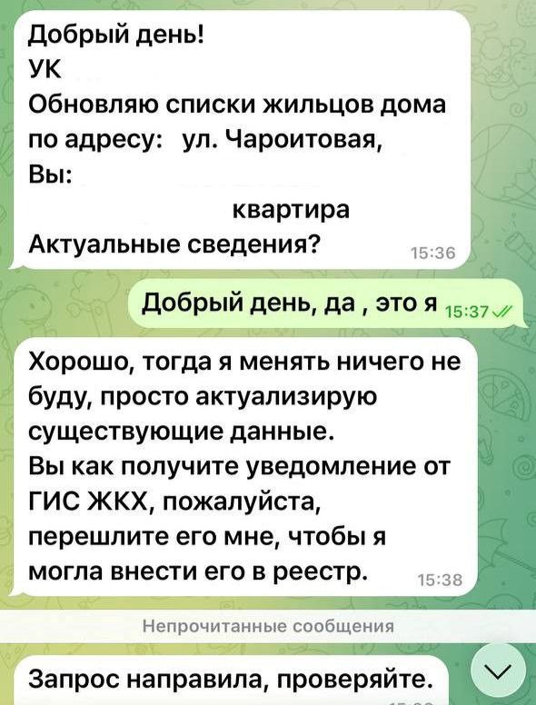 ВНИМАНИЕ! ГИС ЖКХ направляет сообщения собственникам исключительно внутри Личного кабинета. Сотрудники УК и ТСЖ не проводят «перепись» жильцов в мессенджерах.