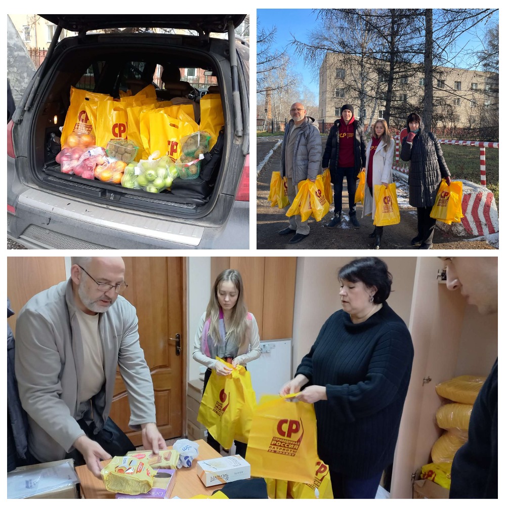 Фото: сотрудники кемеровского Центра защиты прав граждан и партийцы собирают угощения для солдат.