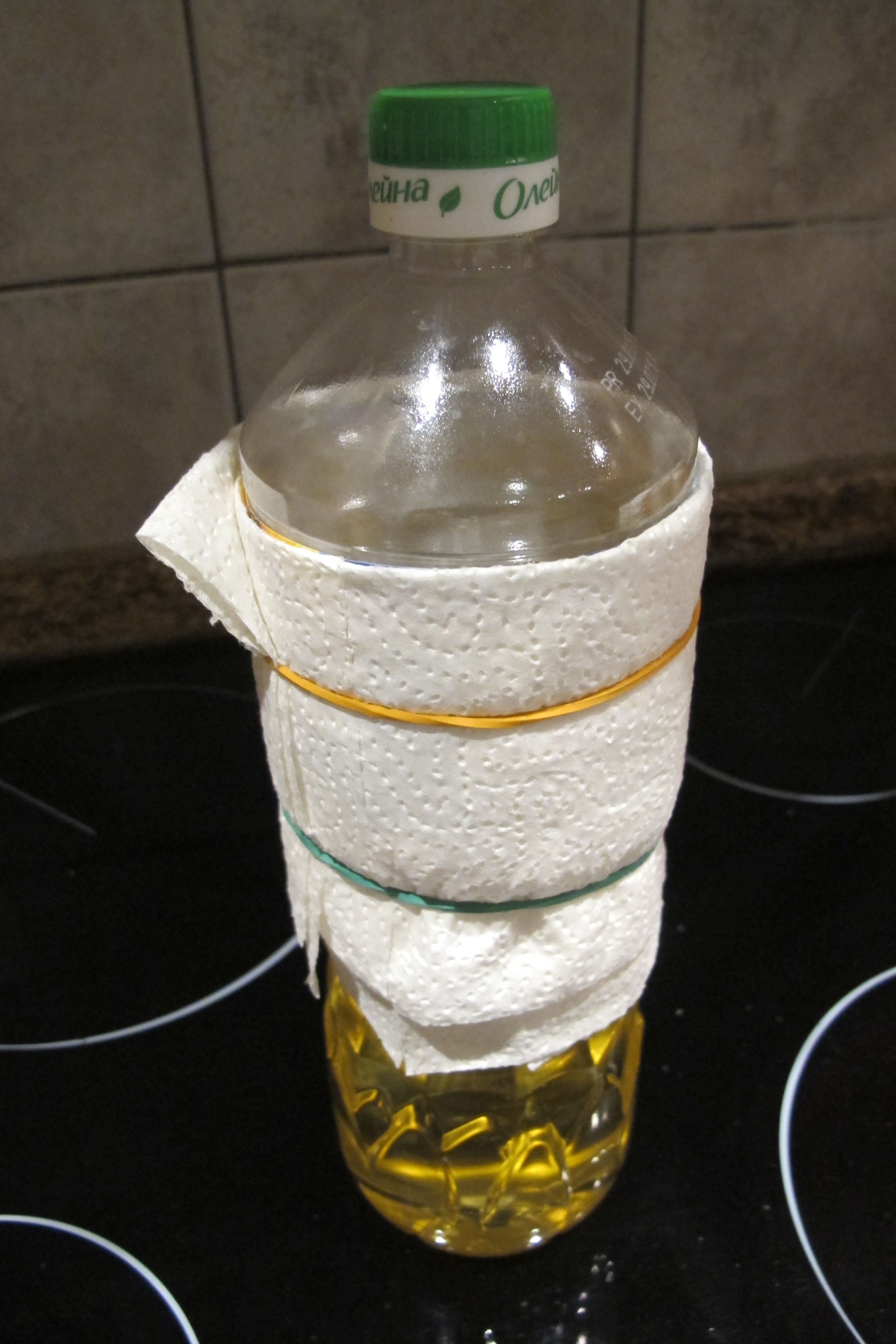 1. Обмотайте бумажное полотенце вокруг бутылки растительного масла и закрепите с помощью резинки. Больше вам не придется пачкать стол и свои руки.