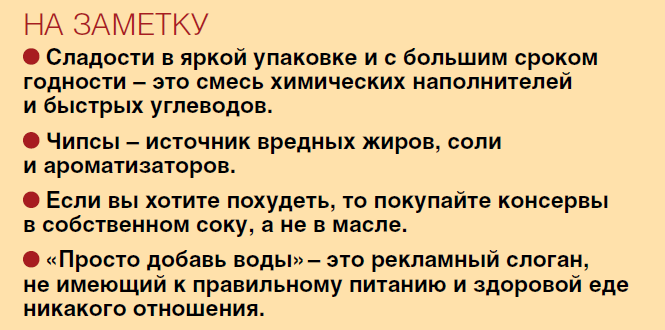 Какой бы яркой ни была их упаковка, сколько бы вас не убеждали производители, что все сделано из натуральных продуктов с использованием лучших специй – не поддавайтесь. Чипсы – это смесь жира, соли, красителей и усилителей вкуса. Супы быстрого приготовления, быстрорастворимые каши и пюре, сухие завтраки. Все это работает по принципу «просто добавь воды». Это очень удобно (не надо долго стоять у плиты), вкусно и даже якобы полезно (производители щедро обогащают свои полуфабрикаты витаминами, о чем большими буквами пишут на упаковке). Одно «но»: такие продукты содержат максимум быстрых углеводов и минимум полезных веществ, а значит, вы не сможете похудеть, как не старайтесь.